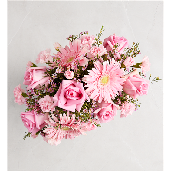 The ultimate arrangement for your favorite fashionista. Roses, Gerbera daisies, and other blooms in delicate shades of pink pop out from the top of our keepsake handbag-shape vase, making this a truly chic gift.
